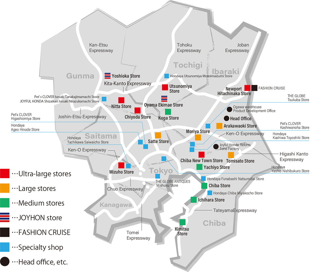 Chiba: 4 stores ・Hondaya Chiba Miyako-cho Store(Professional tools Store) ・Hondaya Funabashi Natsumidai Store(Professional tools Store) ・Hondaya Kashiwa Toyoshiki Store(Professional tools Store) ・Pet's CLOVER Kashiwanoha Store(Pet Store)