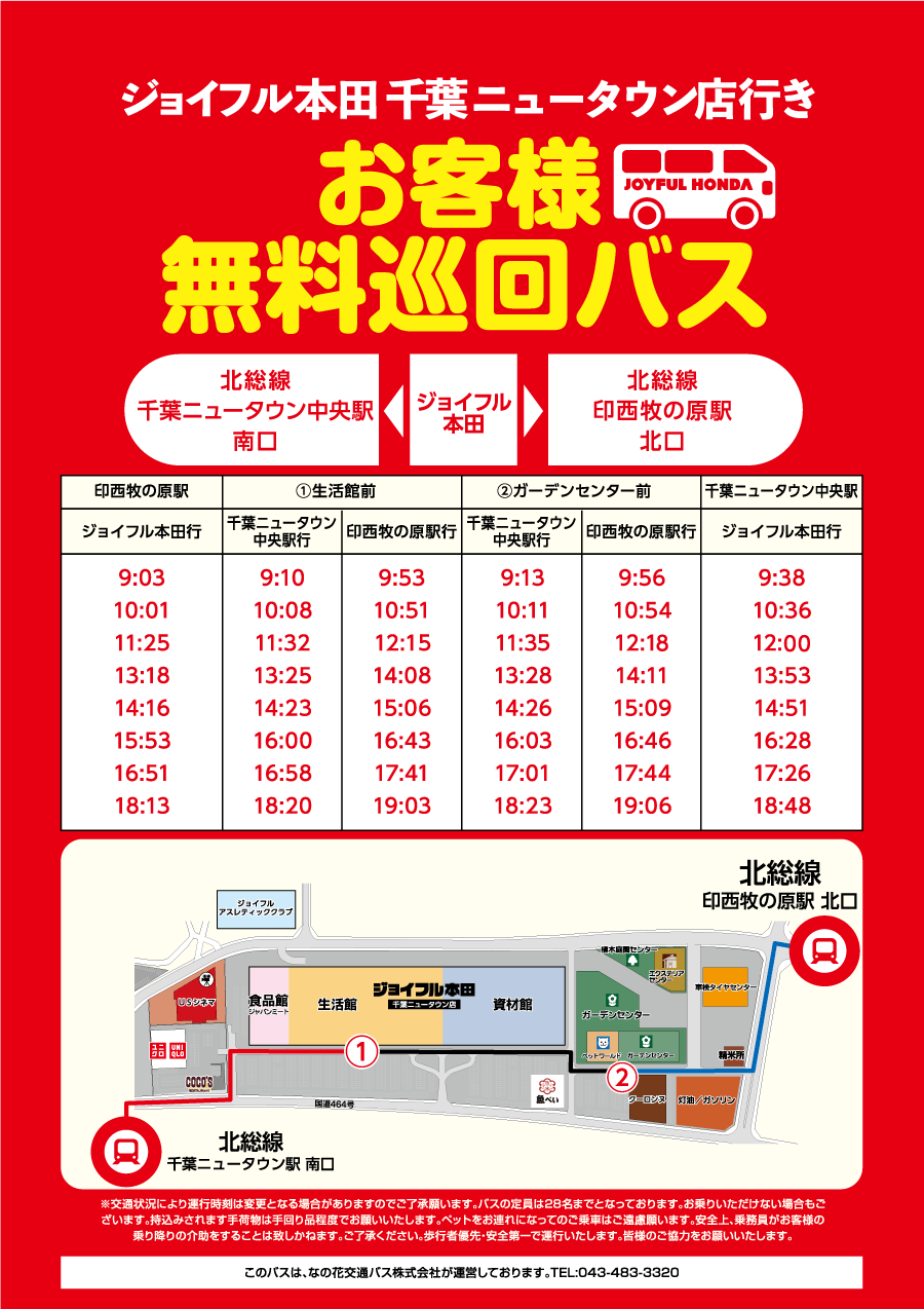 ■千葉ニュータウン中央駅南口⇔ジョイフル本田(所要時間:約15分)■印西牧の原駅北口⇔ジョイフル本田(所要時間:約7分)