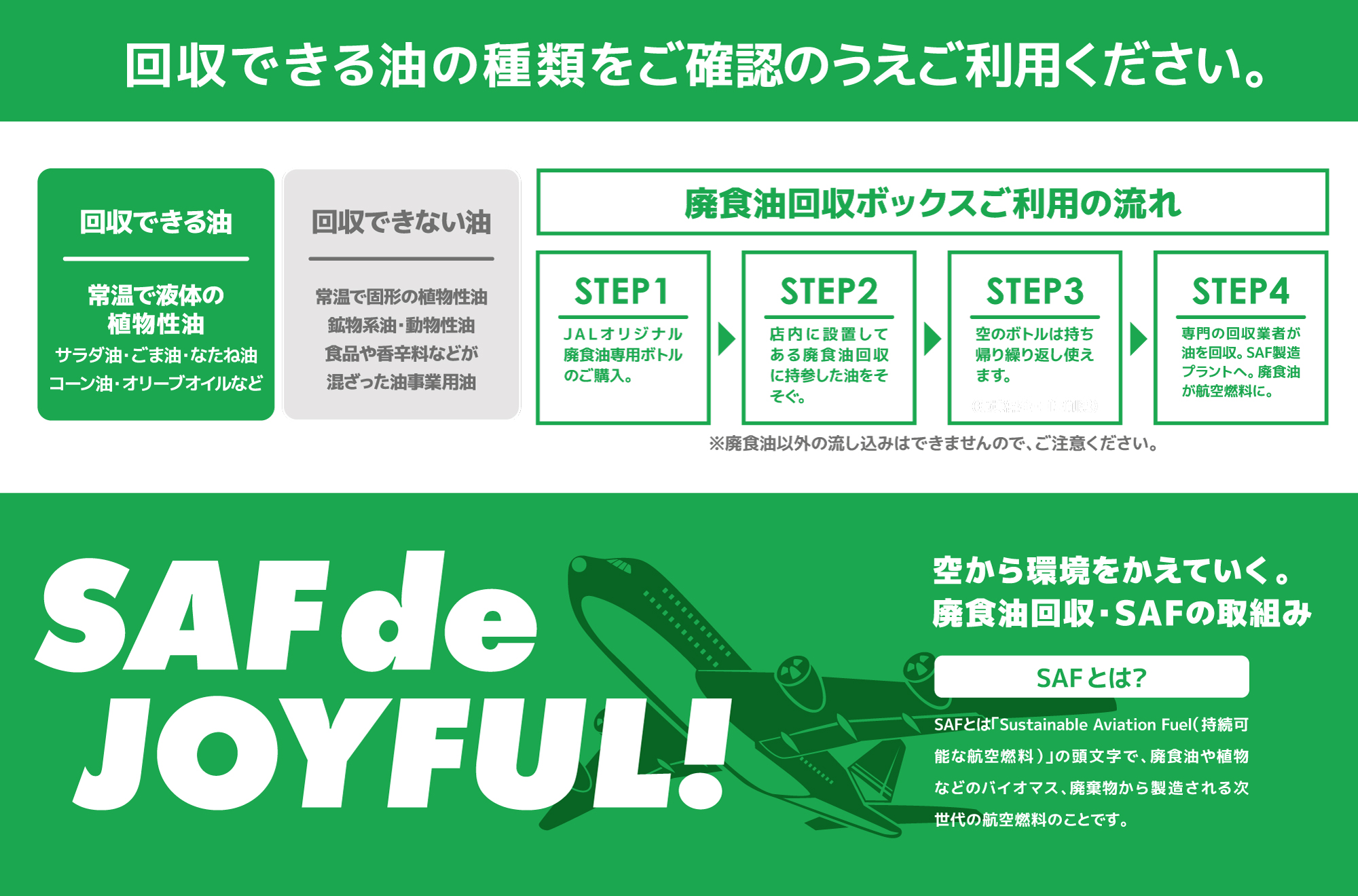 家庭で使い終えた食用油を「捨てる」から「活かす」へ。ジョイフル本田は、日本航空株式会社(JAL)をはじめとする関係機関と連携しながら、地域とともに持続可能な社会の実現に向けた取り組みを今後も継続してまいります。